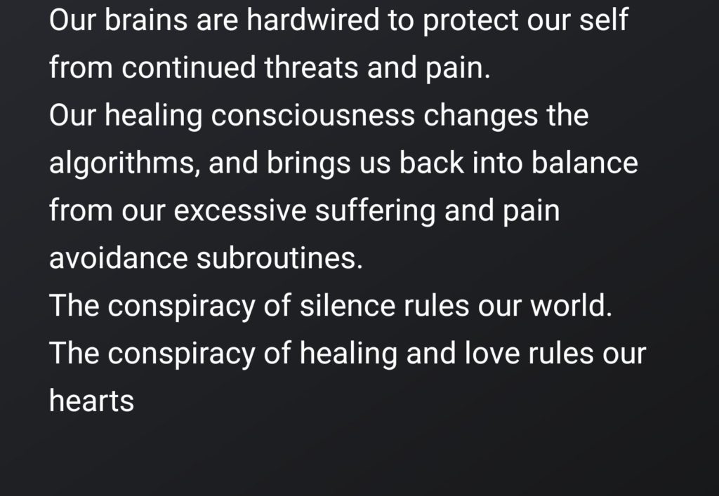 The investigation of personal trauma, my response to it, and my search for truth is an exercise in compassion, understanding, and healing, and need not be maudlin in nature., My intention for this writing was not to bring harm to myself, but to bring a message to the world about the suffering that the world so casually creates, and then denies its own culpability. I wanted to give voice to the millions who already died, went insane, or have been imprisoned because of our shared disease of the spirit, and the collective conspiracy of silence around society’s and religion’s responsibility for it. My hope is to give a voice to the suffering of our world, while pointing in the direction towards where our healing might be found.