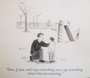 This is the classic attack/defense posture or mechanism that the entirety of the human race is now participating in. Anybody who has worked in the construction trades, or in work areas dominated by men, knows this process quite well. The terms repartee, badinage, bantering, persiflage, etc. are the kind names given to this culturally accepted, and sometimes revered process, whereby we “lightly and without intentional malice” impugn the dignity and reputation of others, through pokes at each other. We call this “humor”, and some may feel almost hurt when others do not engage in this behavior with us. This has been an accepted standard of behavior (though we are finally awakening to darker aspects of this by identifying hostile work environments and instituting regulations for reducing persecution, racial discrimination, age discrimination, sexual harassment and sexual discrimination in the workplace).