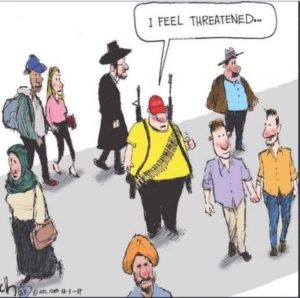 As a world civilization, we try to regulate our atomic weapons, yet we let other weapons of mass destruction run free. Would you allow the arming of groups of mad men with nuclear weapons (white supremacists like our POTUS or Kim Jung Un notwithstanding)? We all must be protected from the atom bombs. We all must be protected from the guns that are designed for and used to kill people. It is impossible to protect us from all of the bullying lunatics out there in the world brandishing their weapons of mass murder, so we must act rationally, and decisively, to thwart the self-destructive and other-destructive tendencies of unevolved, fear based males. We don’t allow children to drive cars, which are dangerous in their immature hands. Men who think they need guns to protect themselves from philosophical extensions of their own fear, ignorance, and hatred are also children, and should be treated accordingly.  Politicians who cater to children deny the ability of the culture to accept and adopt more rational, healing approaches to the historical and cultural predisposition to male violence.