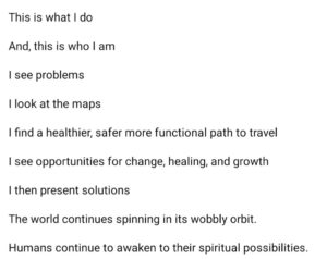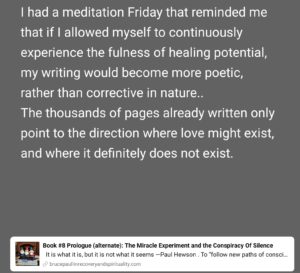 This is a multi- media experiment using many memes, songs, poems, photographs, and prayers.  There is some supportive writing from me with a few excerpts from the previous eight books that I have written. My desire to enhance the general public’s interest in my writing has become an extraordinarily expensive proposition for me, and I understand that I may fail in my intentions.