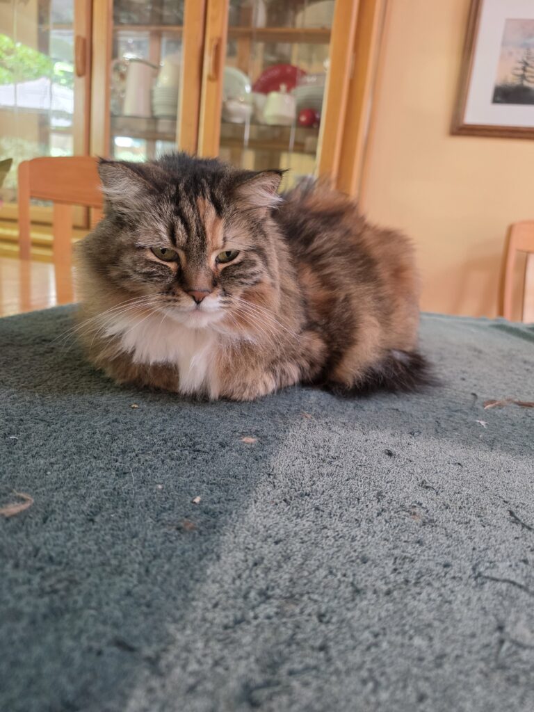 Sassy had her own history of fragility and survival. When she was four years old, she had suffered serious health issues, grave enough that her original owners surrendered her to the local humane society for treatment or euthanasia, depending on how things unfolded. Removed from that first environment, she improved. She lived. And that is how my aunt came to adopt her in 2015. The cat who might have disappeared instead continued on, changing homes, changing names, continuing her quiet little life like a thread moving through different hands. And now she was now in ours.